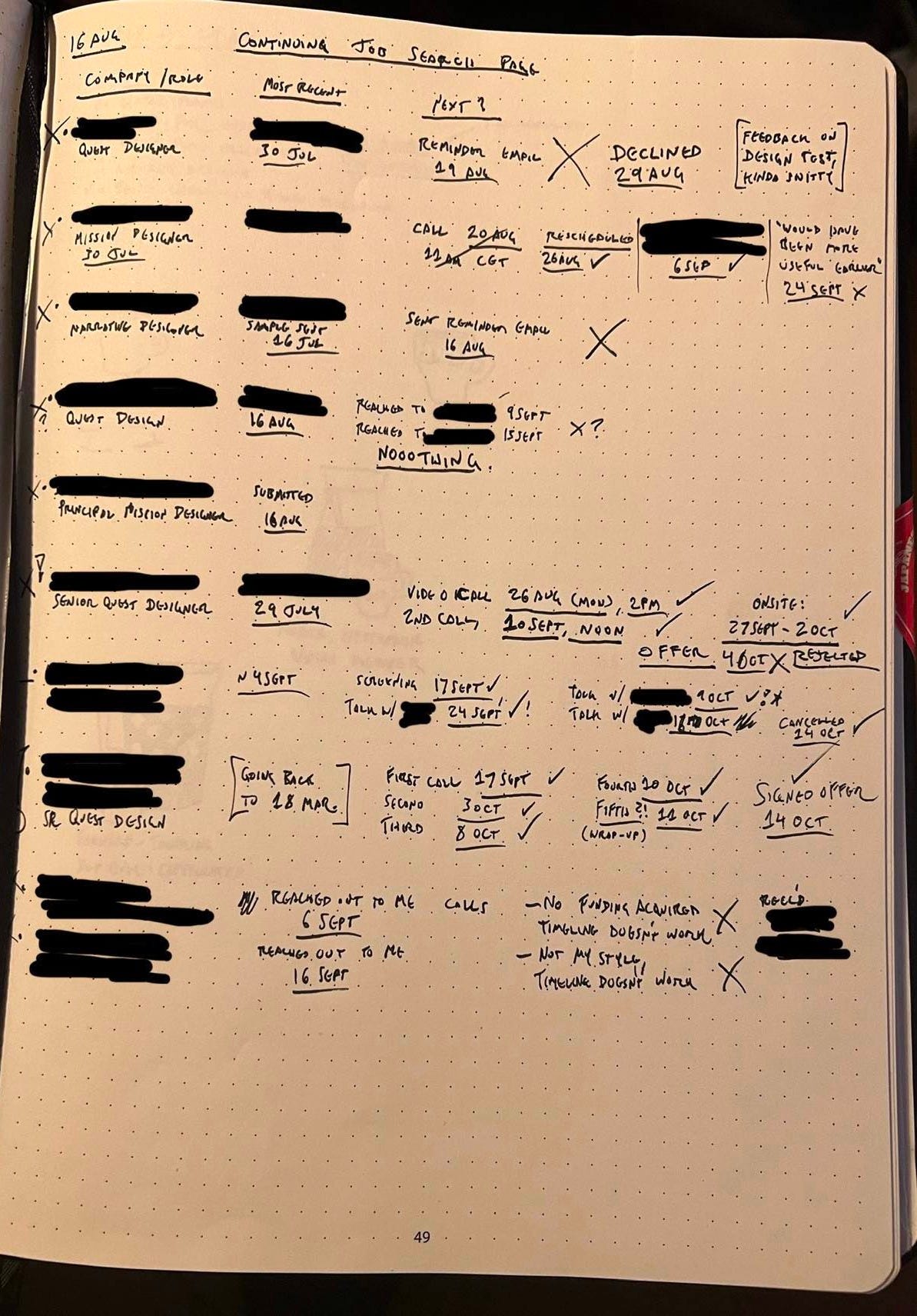Nowadays, there’s no shortage of sites that you can use to find job listings these days, from the obvious social media ones to more niche sites focused on the game industry. They each have their advantages and disadvantages, so you may want to keep an eye on multiple sites to cover any issues. There’s similarly no shortage of sites that give all the basic tools for building a good resume, cover letter, and community. If you don’t already have a preference, Amir Satvat’s Games Community seems to be the hot one right now (although I didn’t use it, so I can’t personally vouch for it).